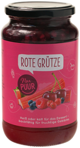 Früchte* 51% in veränderlichen Gewichtsanteilen (Rote Johannisbeeren*, Kirschen*, Rhabarber*, schwarze Johannisbeeren*, Himbeeren*), Wasser, Rohrzucker*, Maisstärke*.| Energie | Fett | gesättigte Fettsäuren | Kohlenhydrate | Zucker | Ballaststoffe | Eiweiss | Salz |