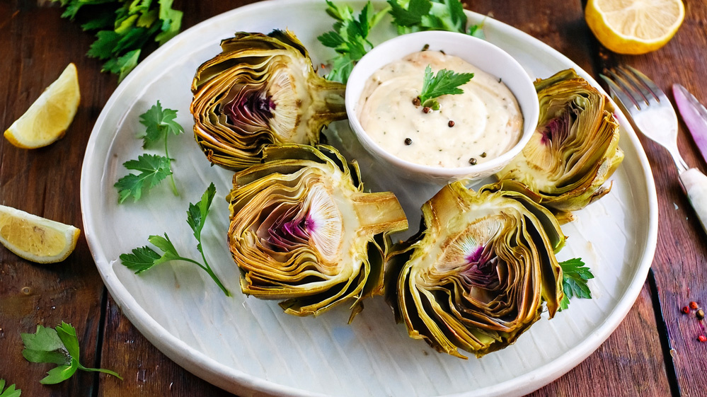 Nun können die Blätter der Artischocke abgezupft werden und die abgezupfte Seite in den Dip getaucht werden. Einfach „abzuzzeln“ und so bald alle Blätter abgezupft sind und das Heu erscheint, dieses abschneiden und den Boden der Artischocke genießen.