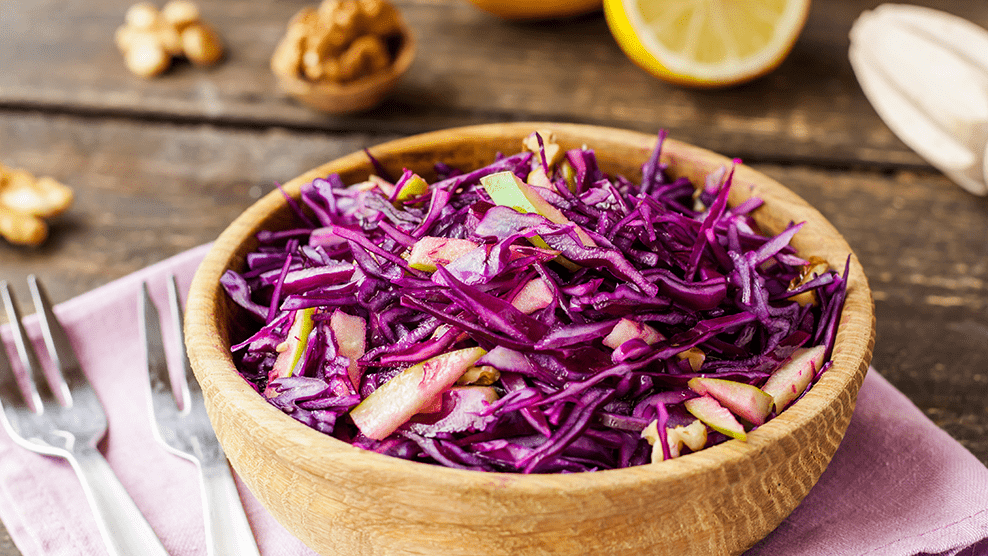 Den Rotkohl vom Strunk befreien und dann in sehr dünne Streifen schneiden oder raspeln. In einer großen Schüssel mit Salz und Zucker ein paar Minuten kräftig kneten. Dann die Äpfel waschen, entkernen und stiften. Die Walnüsse fein hacken und zu dem Salat dazu geben.