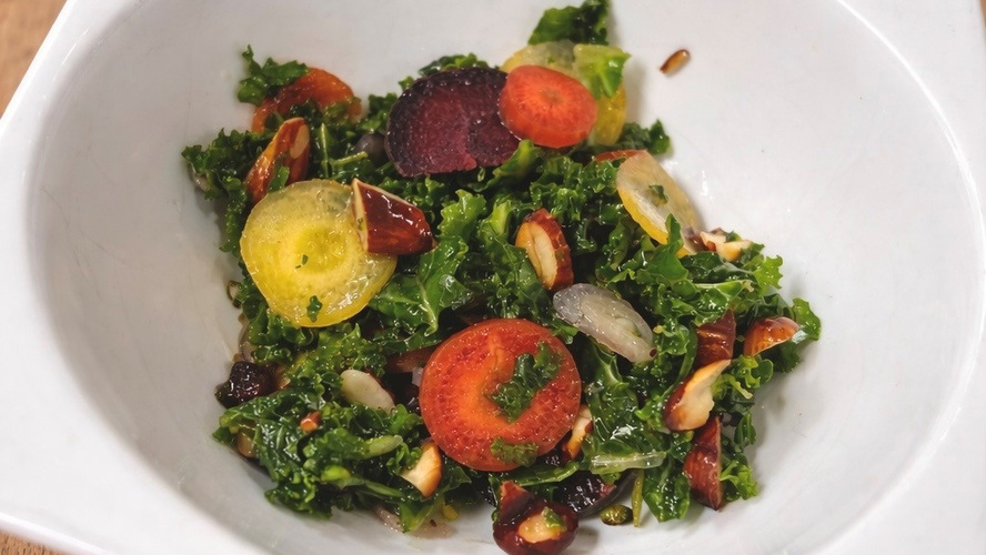 Grünkohlsalat mit Ur-Möhren, gerösteten Mandeln und Orangen-Senf-Dressing